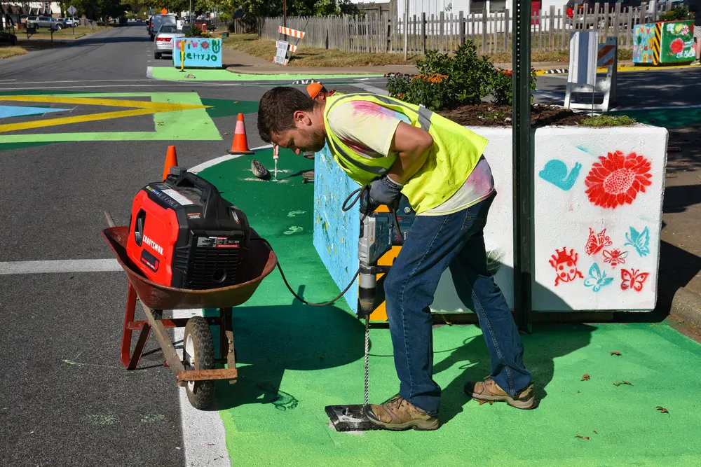 âś… The city installed a four-way stop, painted on-street parking, and delivered concrete planter boxes.